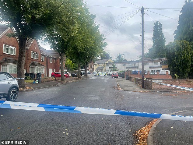 Se alega que Mahamed Mahamad, de 37 años, apuñaló al trabajador del DPD Aqeef Ali 29 veces con un enorme cuchillo de sierra aquí en Gibson Road, Handsworth en Birmingham (en la foto: la escena en las horas posteriores al ataque).