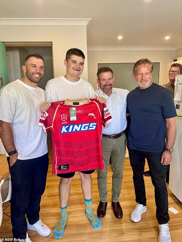 Una foto de las celebraciones compartida por la asociación mostraba al oficial de policía sonriente junto al Sr. Allwood, Mark Bouris en representación de la NRL y el capitán de los Sydney Roosters, James Tedesco.