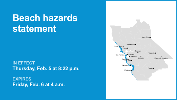 La costa norte de la Bahía, incluida la costa nacional de Point Reyes, la costa de la península de San Francisco, el norte de la bahía de Monterey y el sur de la bahía de Monterey y la costa de Big Sur, así como el condado de San Francisco, se encuentran bajo una Declaración de peligro de playa emitida por el Servicio Meteorológico Nacional a las 8:22 p.m. Jueves. La declaración es válida hasta las 4 a.m. del viernes 6 de febrero.