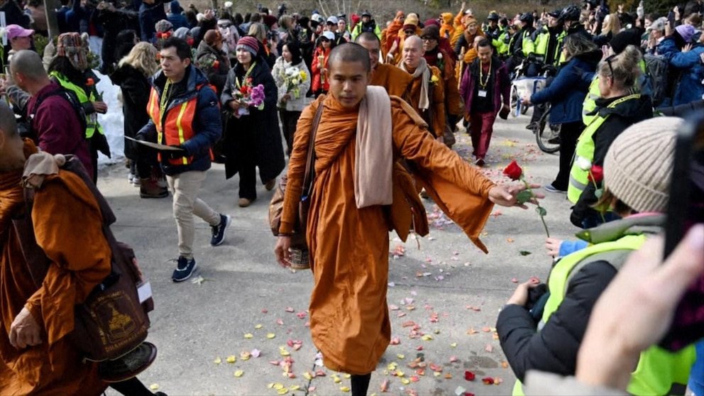 Un grupo de monjes budistas con un mensaje de paz marchó hacia el corazón de Washington, D.C. el martes y fueron recibidos por grandes y alegres multitudes mientras completaban su viaje de 15 semanas desde Texas.