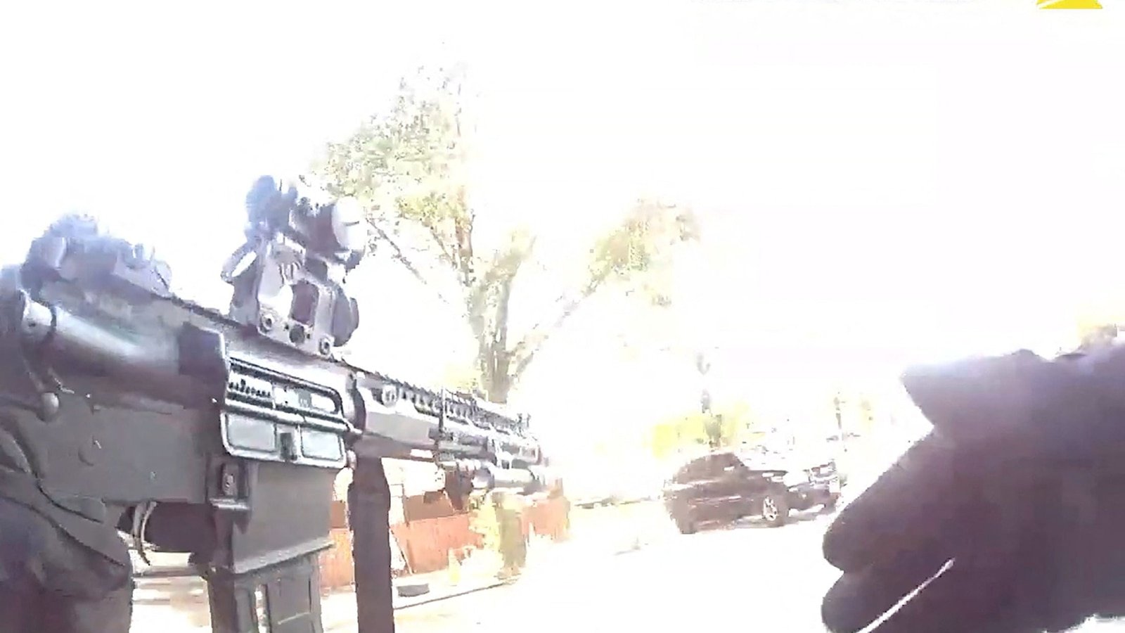 El agente prepara un rifle de asalto. Con el dedo en el gatillo, se puede escuchar a uno de los agentes decir algo que suena como si estuviera diciendo “haz algo b—-” o “golpea algo b—-“.