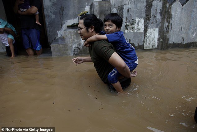 Los residentes atraviesan inundaciones en zonas residenciales del este de Yakarta el 19 de febrero de 2021